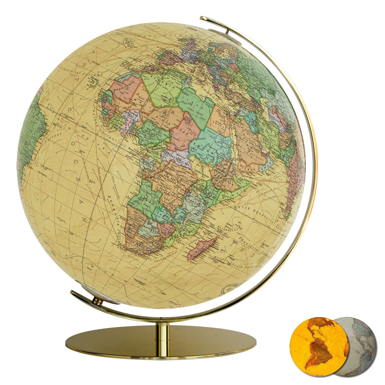 Sie suchen einen ganz besonderen Globus der ein nostalgisches Flair verströhmt, wollen aber nicht auf ein aktuelles politisches Kartenbild verzichten? Dann sind Sie mit dem Columbus Royal fündig geworden. Dieser Globus kann optional beleuchtet oder unbeleuchtet genutzt werden. Beleuchtet strahlt er mit seiner harmonischen Farbgebung eine besondere Wärme aus und unterstreicht den traditionellen Charakter der entsprechend ausgestatteten Globen und zeigt Ihnen detailliert die Gebirgszonen und Höhenzüge unserer Erde. Unbeleuchtet können Sie ein detailliertes politisches Kartenbild nachvollziehen.